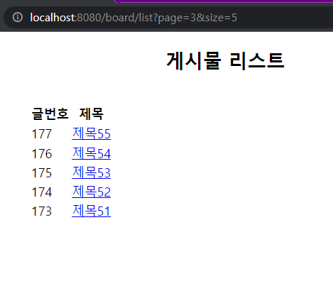 주소창에 파라미터값으로 page=3&size=5 를 줬더니 정상적으로 값이 넘겨진다.