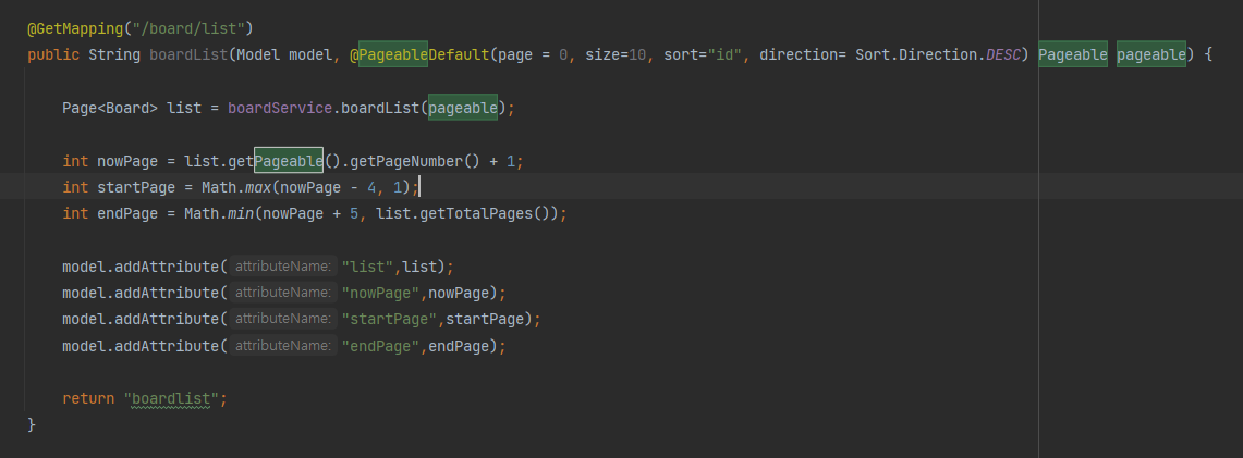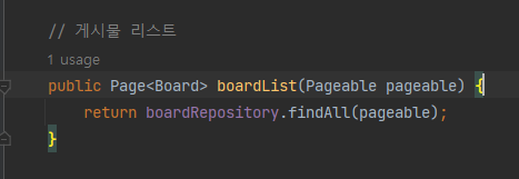 Page 타입의 제네릭 타입으로 Board를 넣고, list는 boardService의 boardList와 pageable을 넘겨준다.