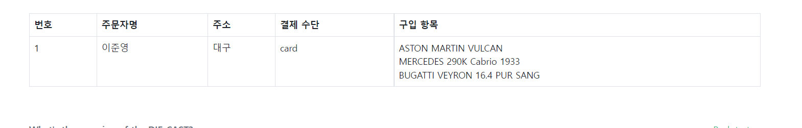 주문 페이지에 구입 목록과 총 금액이 나오게 되고 결제를 하게 되면 장바구니 목록이 사라지게 된다.