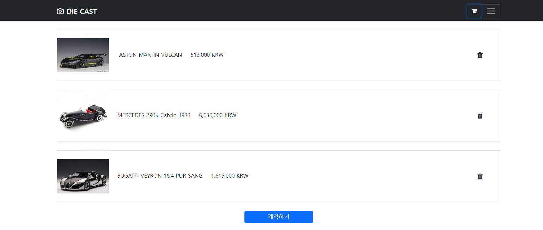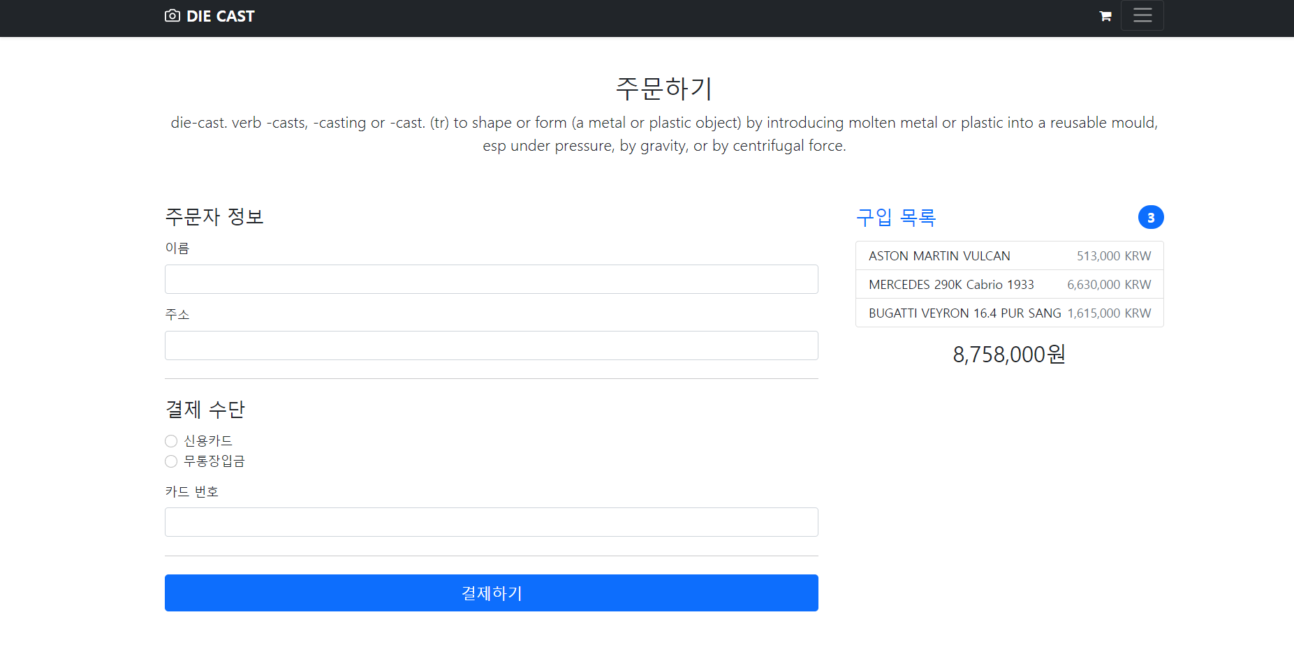 좋아하는 다이캐스트 쇼핑몰을 구현 하였으며 아주 간단한 프로젝트이다.