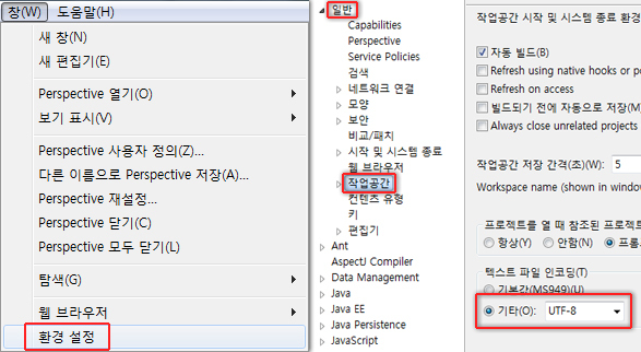 우선 이클립스에서 모든 문서가 UTF-8로 생성이 될 수 있도록 설정을 바꾼다.