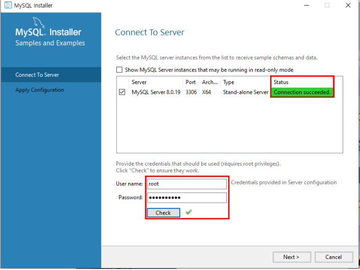 아까 설정한 root 비밀번호 입력 후 Check 버튼 클릭