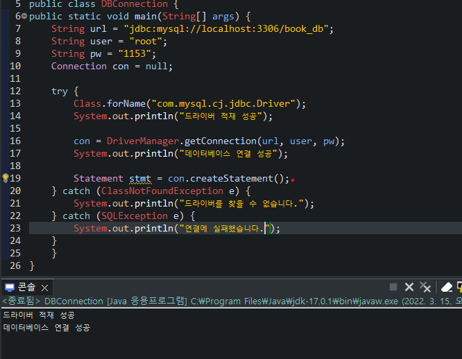 | 1. URL로 지정된 JDBC 드라이버를 적재한다 Class.forName("com.mysql.cj.jdbc.Driver"); 2. 데이터베이스 연결 DriverManager.getConnection(url, user, pw); 3. SQL 문장 작성 및 전송 Statement stmt = con.createStatement(); ResultSet rs = stmt.executeQuery("SELECT * FROM books"); 4. 결과 집합 사용 후 연결 해제 while(rs.next()) { int number = rs.getInt("book_id"); String name = rs.getString("title"); } |