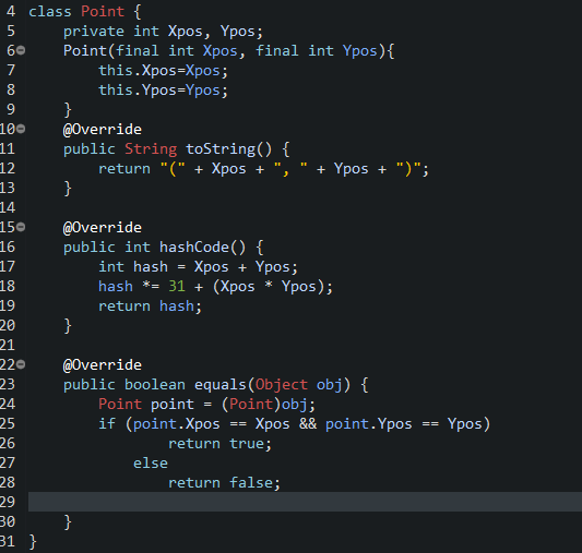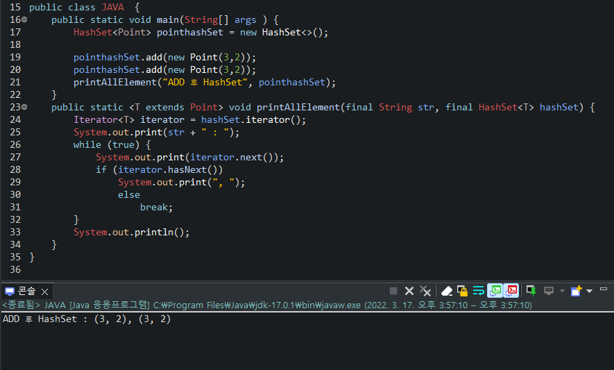 Point 클래스를 만들었다. 이것을 그냥 HashSet에 사용하면 다음과 같은 문제가 발생한다.