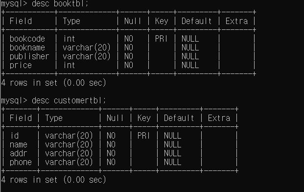 bookcode를 PK로 적용한 booktbl, id를 PK로 적용한 customertbl을 만들었다