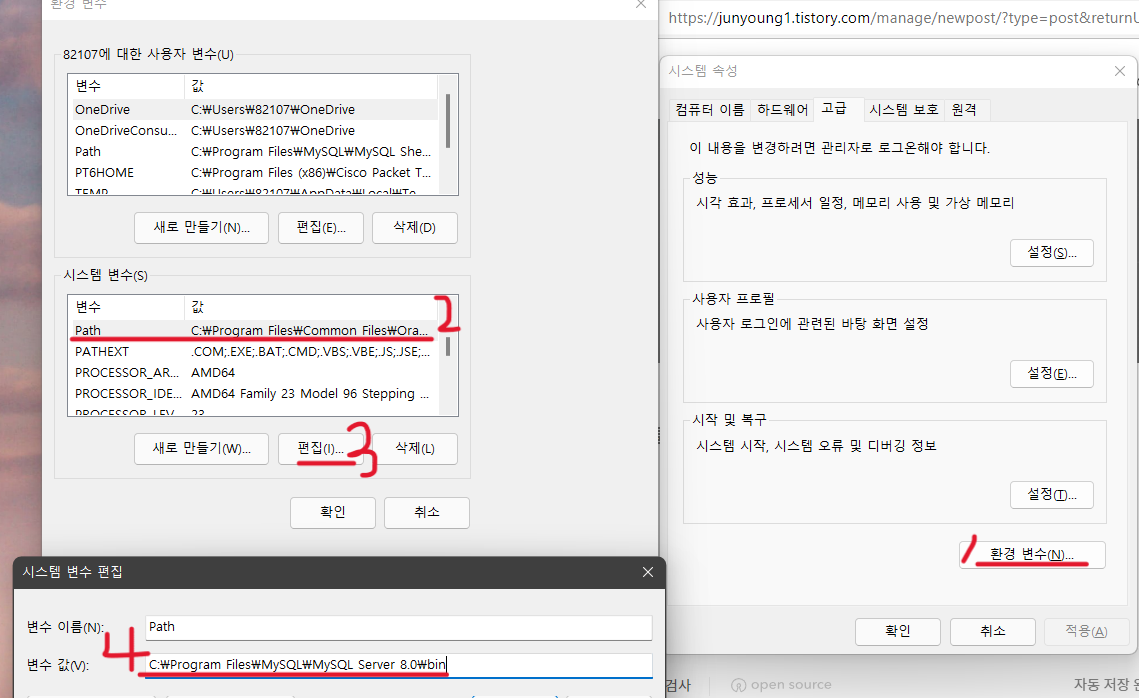 환경 변수를 들어가, Path의 변수 값을 복사한 Mysql 경로를 붙여넣는다.