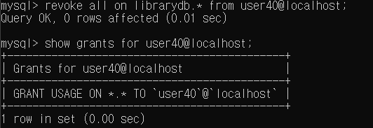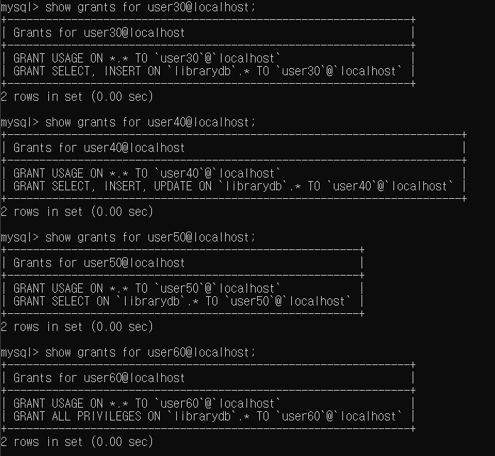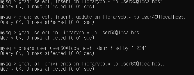 librarydb의 모든 테이블의 모든 권한을 user60에게 부여를 했다.
