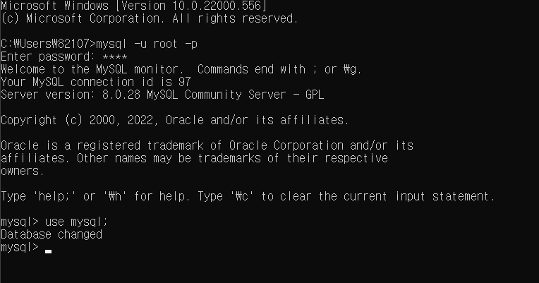mysql 서버에 로그인 후, mysql 스키마를 선택한다.