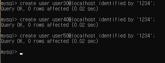 create user username@ip identified by 'password'; 를 통해 host에 사용자를 추가한다.