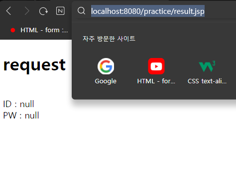 forward 방식으로 값을 전달을 하게 되면 값은 전달되지만, 주소는 resultjsp로 변경이 되지 않는다.