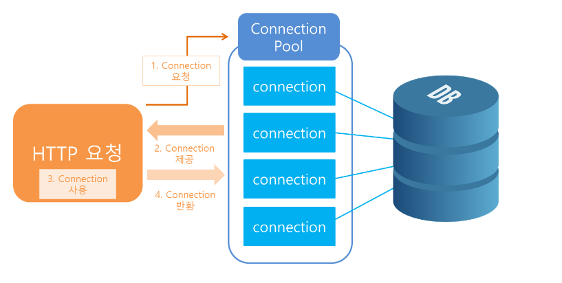 - HTTP 요청에 따라 pool에서 connection 객체를 가져다 쓰고 반환한다.